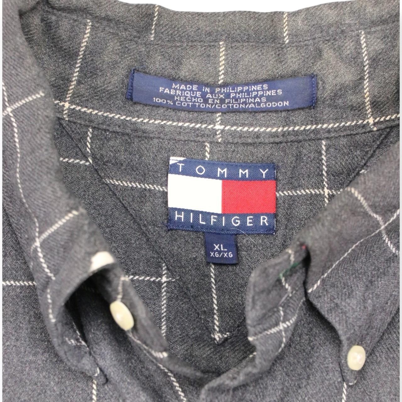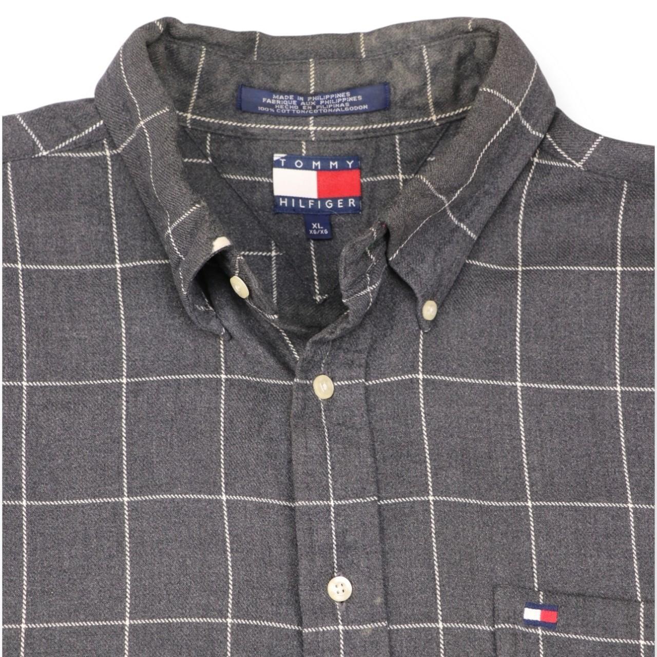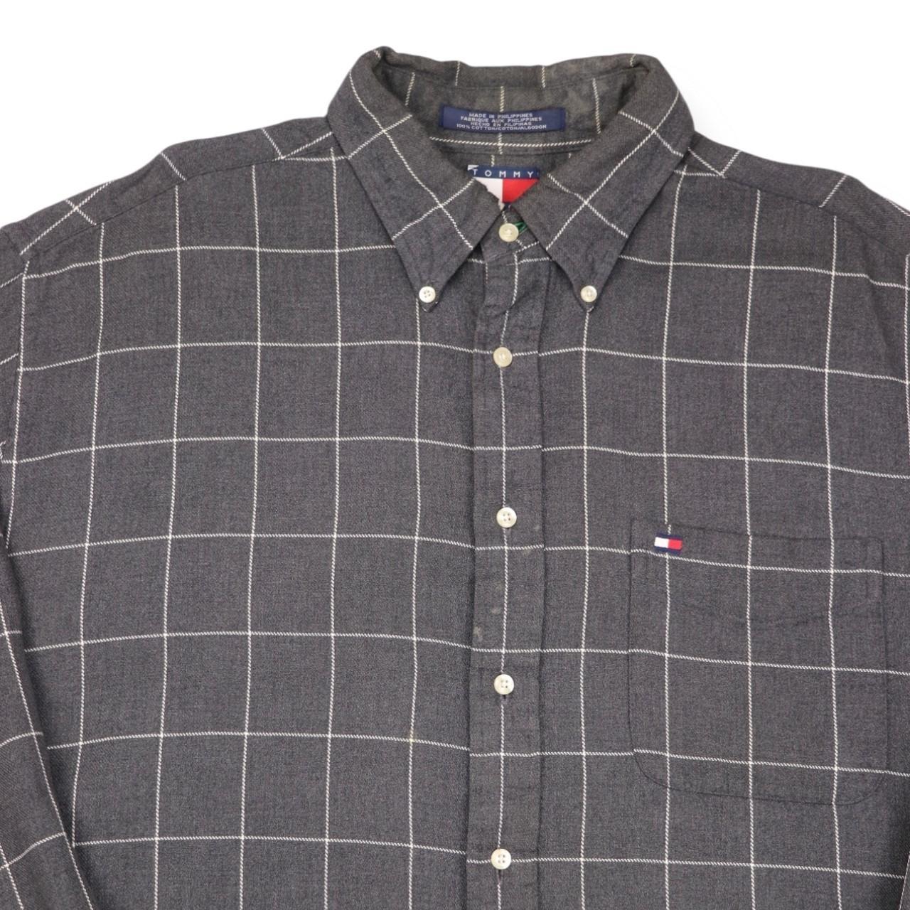 Classic, simple plaid, dark grey, black, Tommy Hilfiger, long sleeved shirt. Small embroidered, Tommy Hilfiger logo found, left hand side, on pocket. Pocket found left hand side of main placket. Comfortable wear. Beige buttons. Button down shirt, giving a classical look. Sophisticated, preppy shirt. Ideal for wear during all types of seasons. Easy care. Regular fit. Perfect for any formal/ semi- formal occasion. Great for gifting. Luxurious piece.