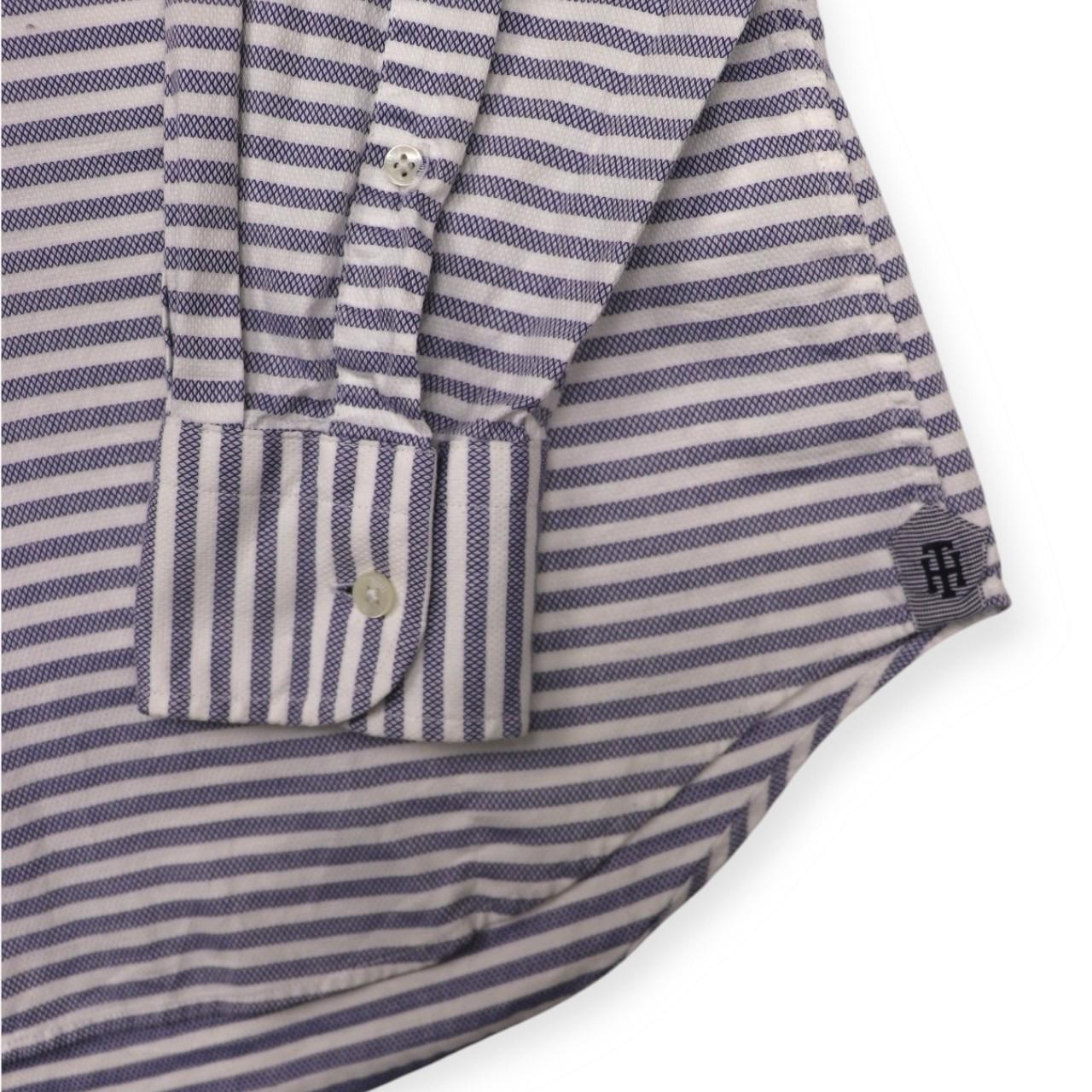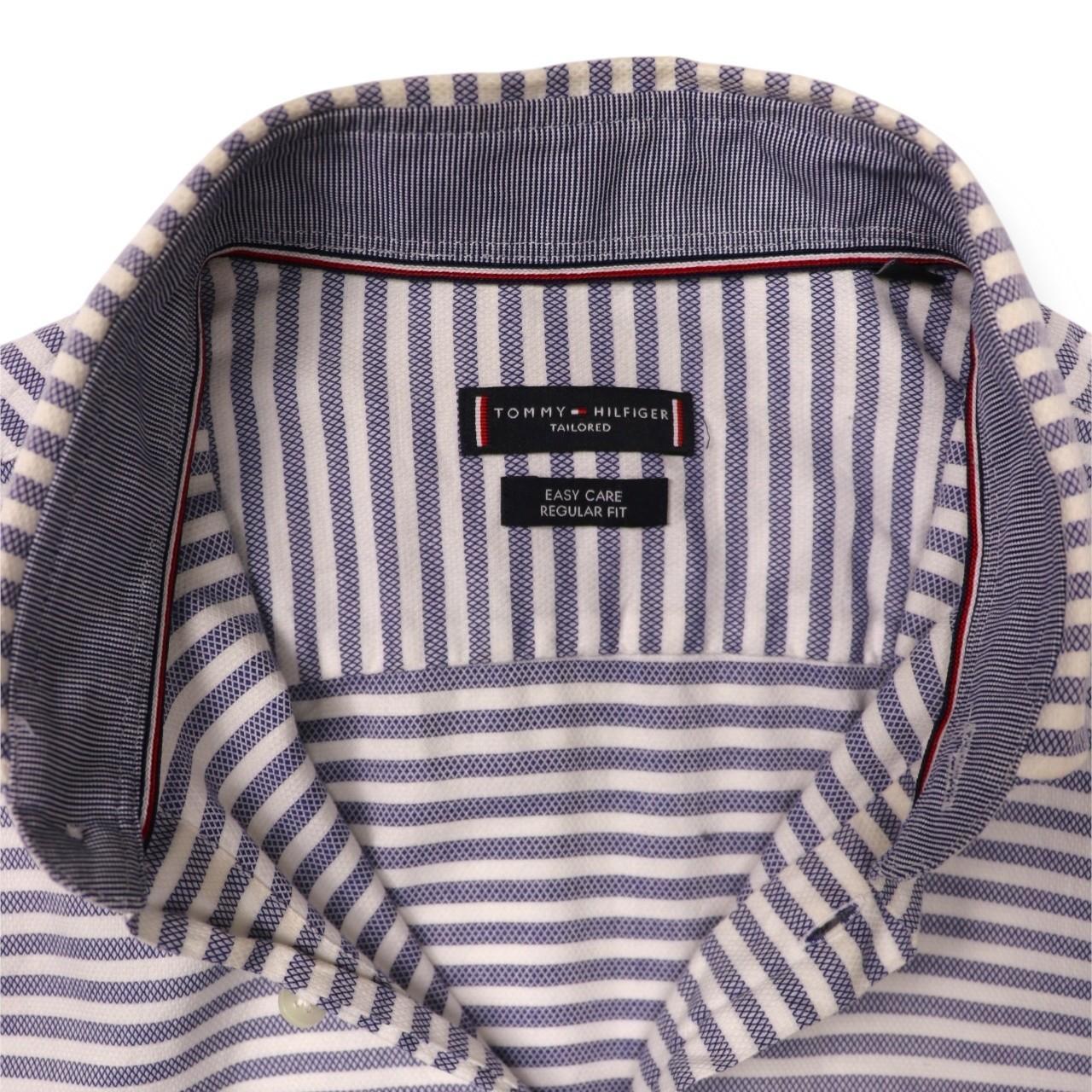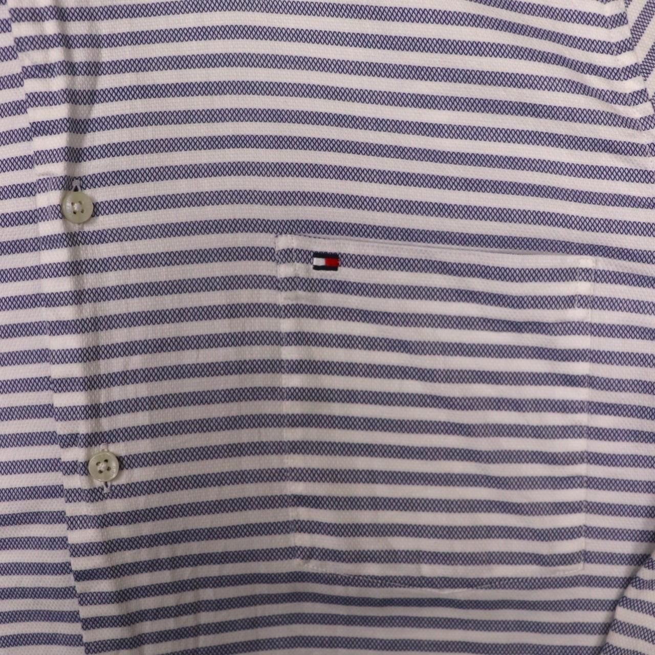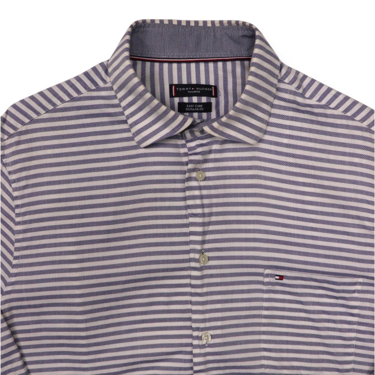 Classic, blue and white, tailored Tommy Hilfiger, long sleeved shirt. Small embroidered, Tommy Hilfiger logo found, left hand side, on pocket. Pocket found left hand side of main placket. Horizontally striped design. Additional elegant Tommy Hilfiger logo found down hemline towards bottom of shirt, giving a classical look. Sophisticated, preppy shirt. Ideal for wear during all types of seasons. Button found on rear of collar. Tailored. Easy care. Regular fit. Perfect for any formal/ semi- formal occasion. Great for gifting. Luxurious piece.