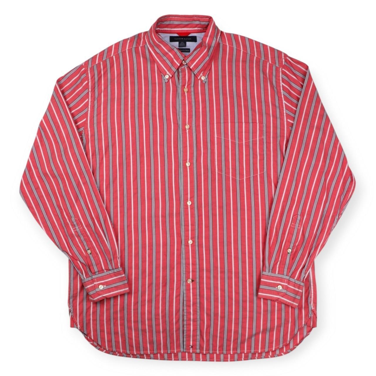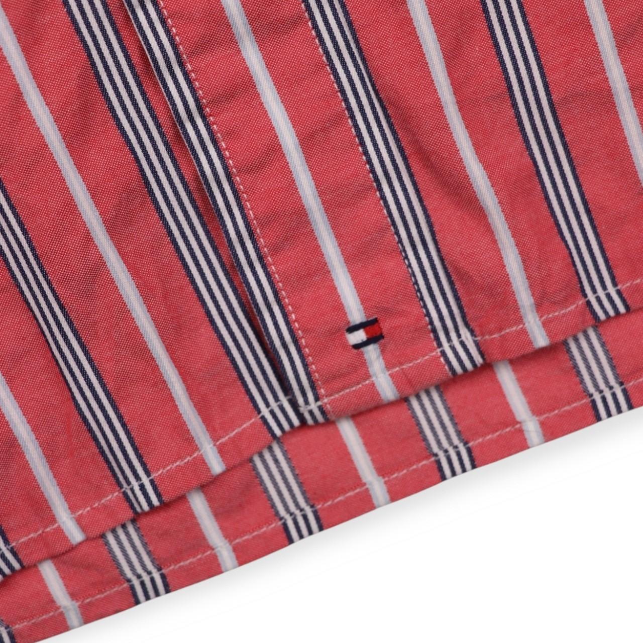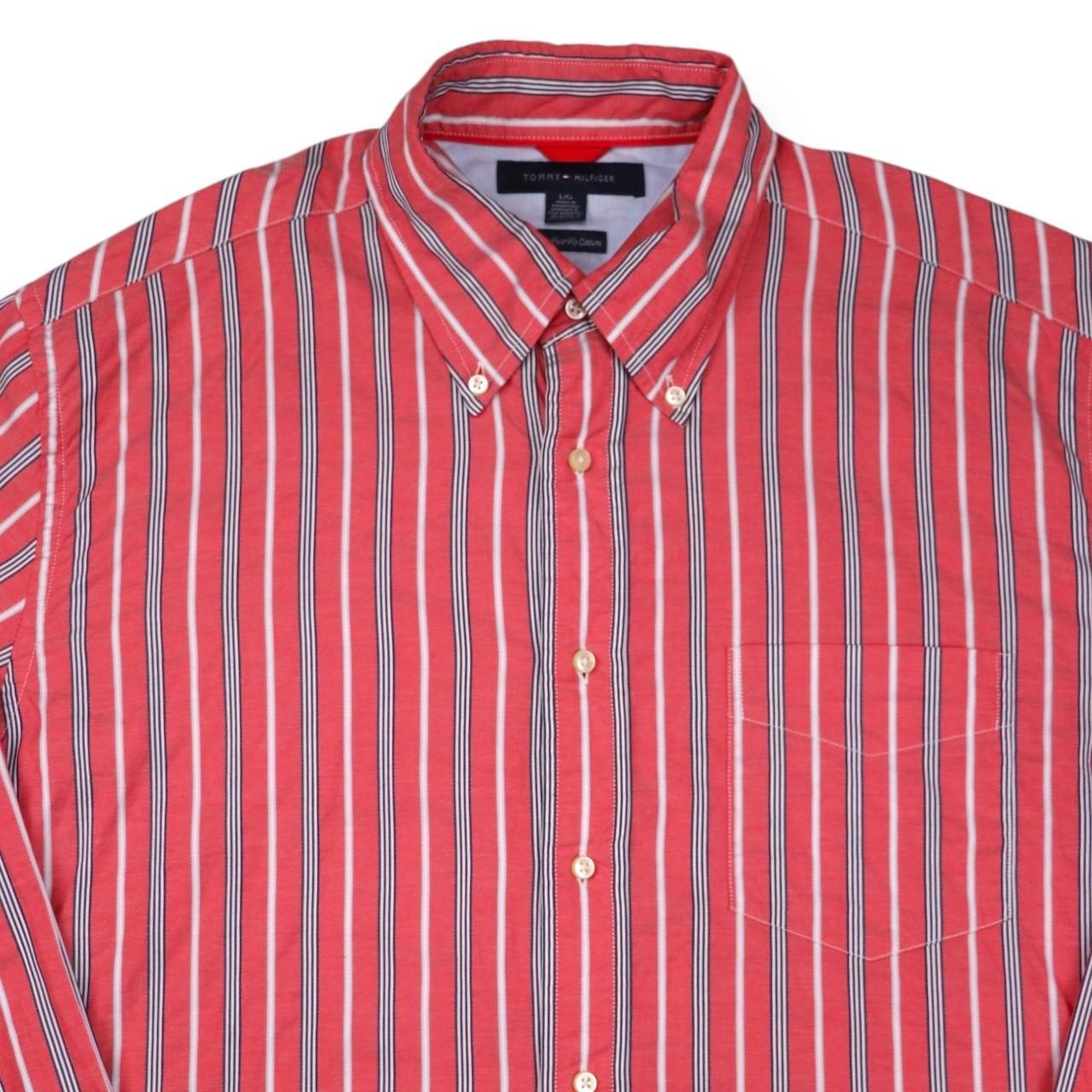 Classic, coral, blue and white, vertical striped, Tommy Hilfiger, long sleeved shirt. Small embroidered, Tommy Hilfiger logo found, on lower hem, at bottom of the shirt. Pocket found, left hand side of main placket. Beige button closure. Button down shirt, giving a classical look. Sophisticated, preppy shirt. Ideal for wear during all types of seasons. Easy care. Regular fit. 80's two ply cotton. Well served, vintage piece. Perfect for any formal/ semi- formal occasion. Great for gifting. Luxurious piece.