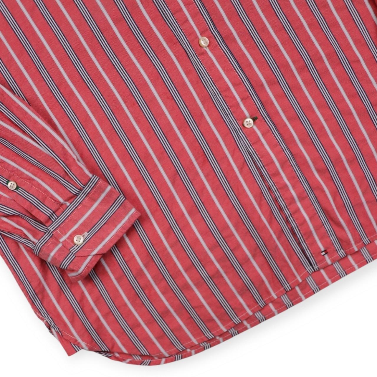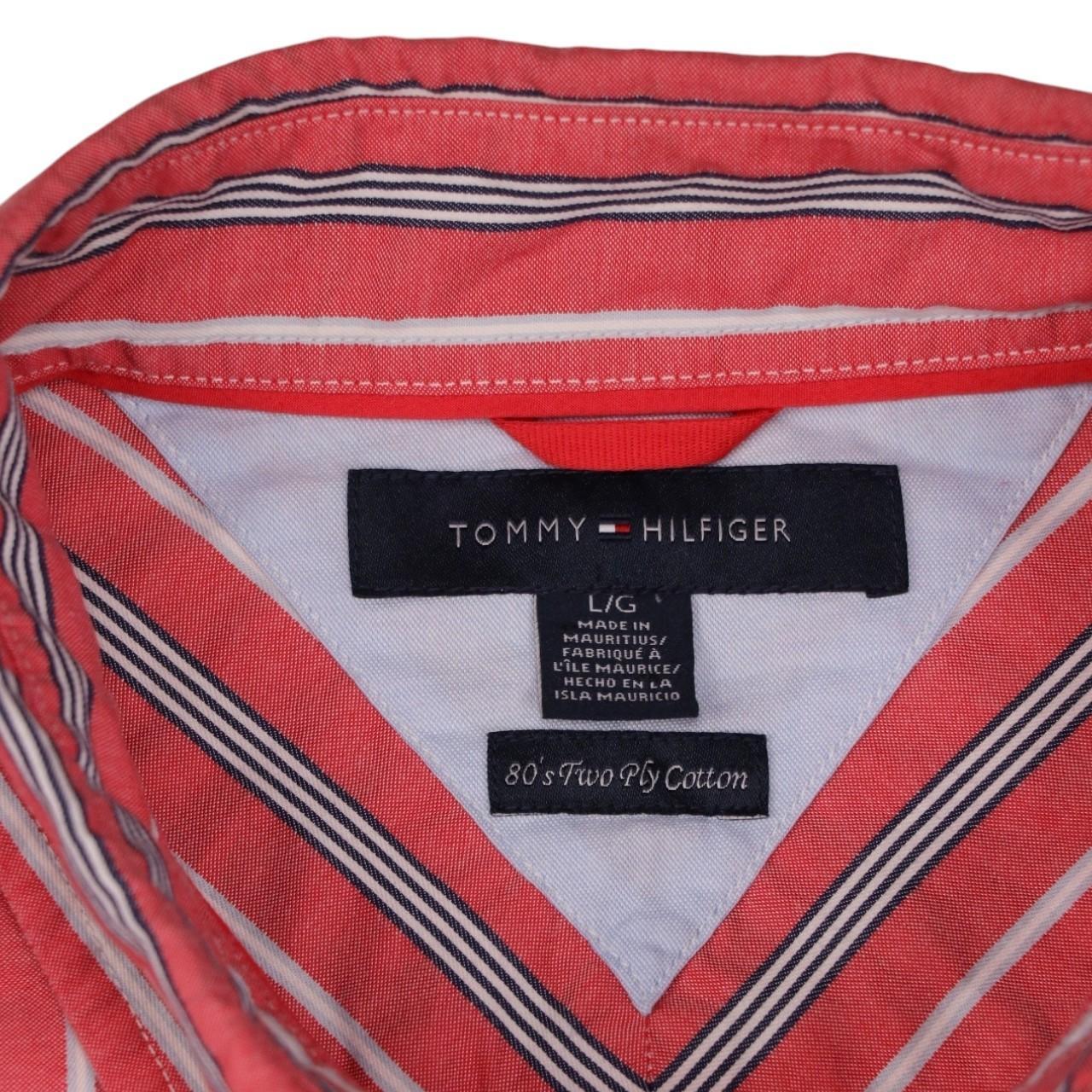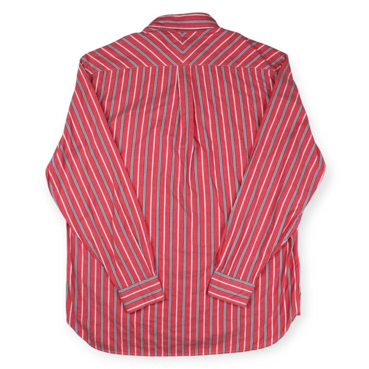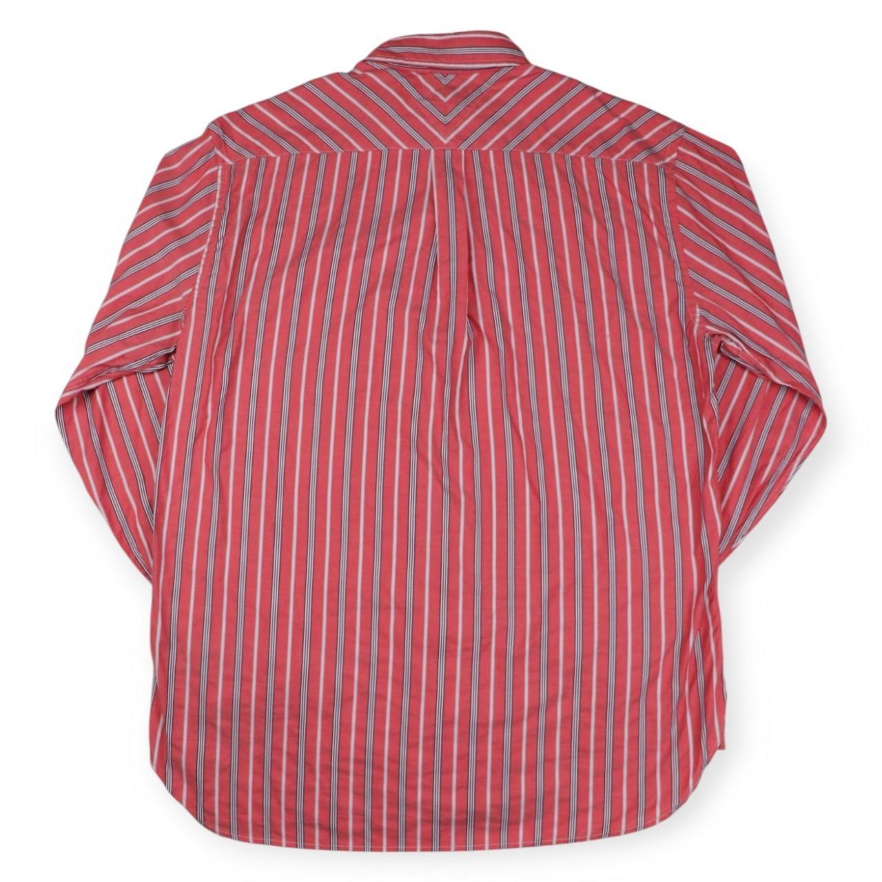 Classic, coral, blue and white, vertical striped, Tommy Hilfiger, long sleeved shirt. Small embroidered, Tommy Hilfiger logo found, on lower hem, at bottom of the shirt. Pocket found, left hand side of main placket. Beige button closure. Button down shirt, giving a classical look. Sophisticated, preppy shirt. Ideal for wear during all types of seasons. Easy care. Regular fit. 80's two ply cotton. Well served, vintage piece. Perfect for any formal/ semi- formal occasion. Great for gifting. Luxurious piece.