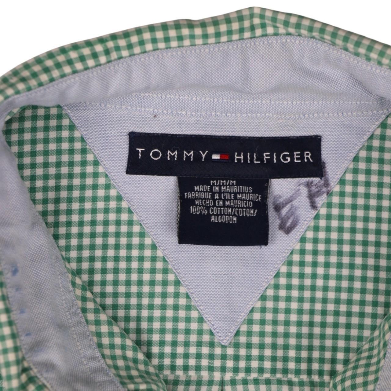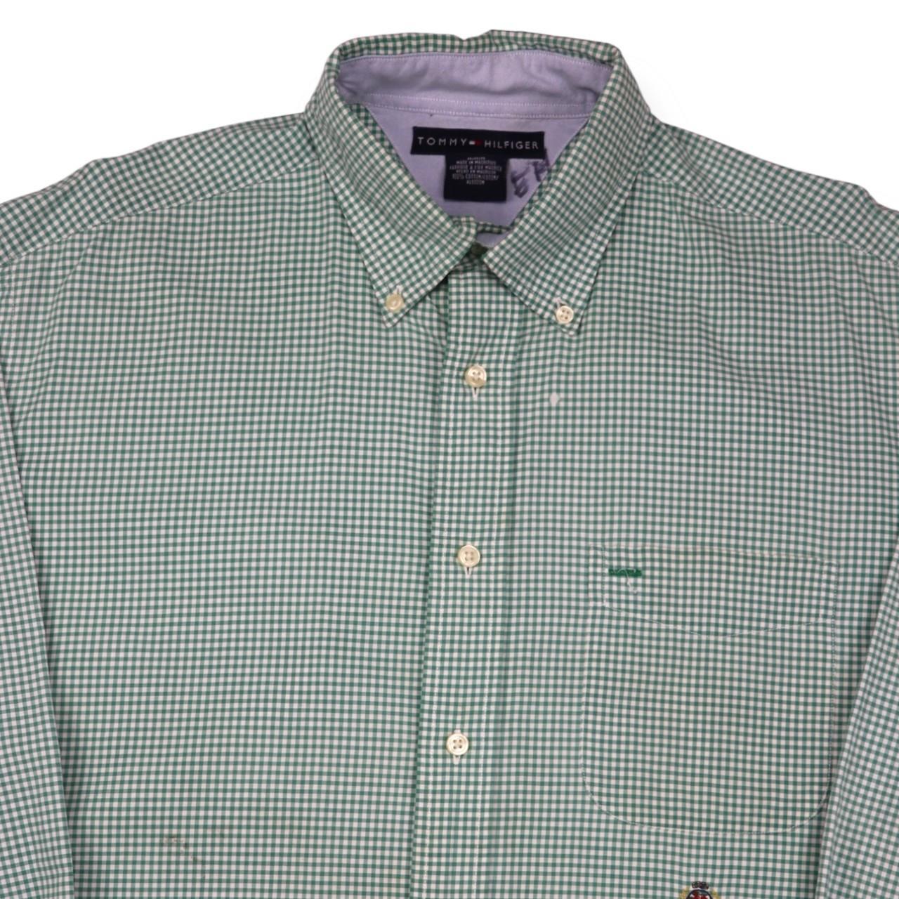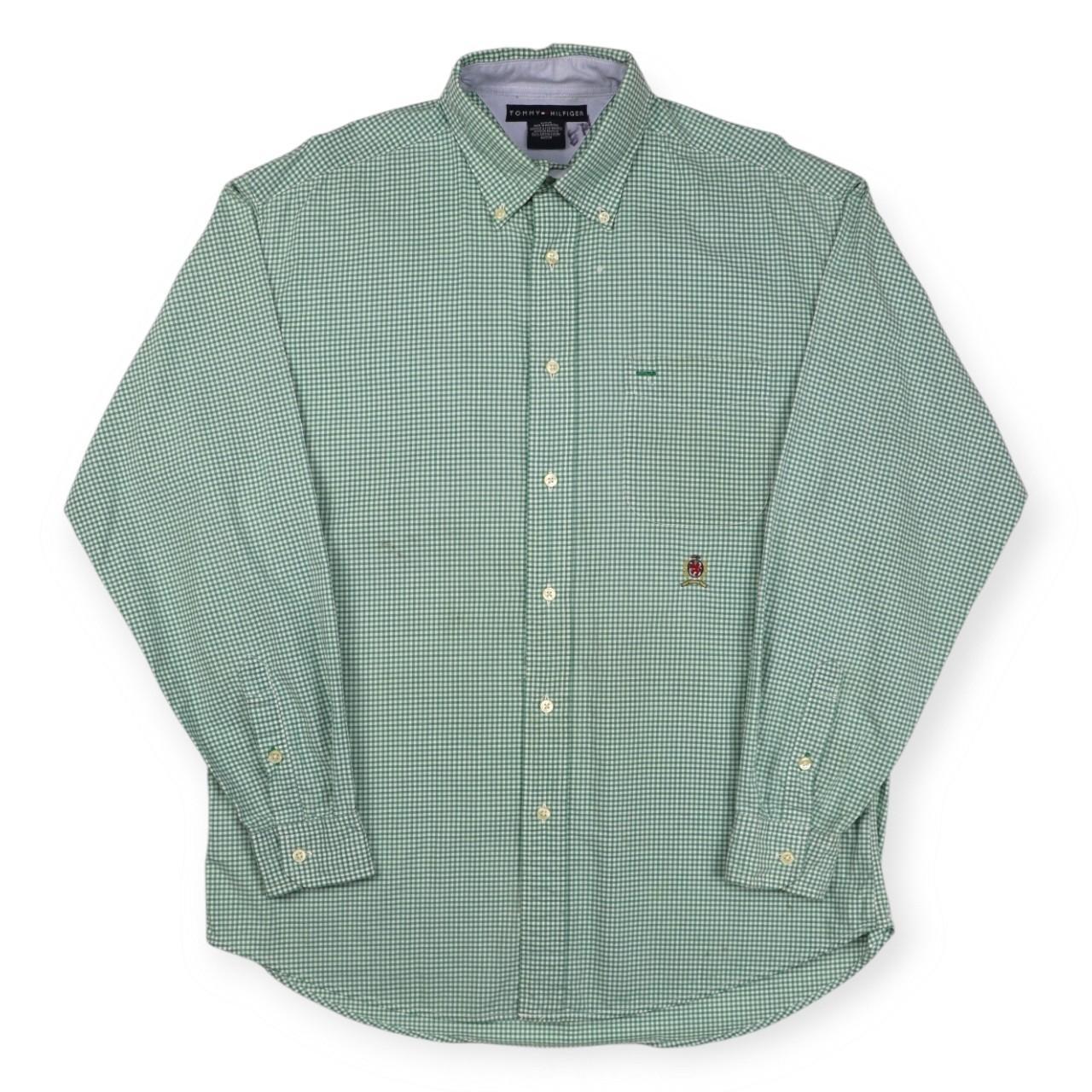 Classic, pastel green and white, Tommy Hilfiger, long sleeved shirt. Large embroidered, Tommy Hilfiger, vintage crest logo found, left hand side, underneath pocket. Pocket found, left hand side of main placket. Tight, plaid design. Sophisticated, preppy shirt. Ideal for wear during all types of seasons. Button found on rear of collar. Regular fit. Perfect for any formal/ semi- formal occasion. Great for gifting. Luxurious piece. Retro item.