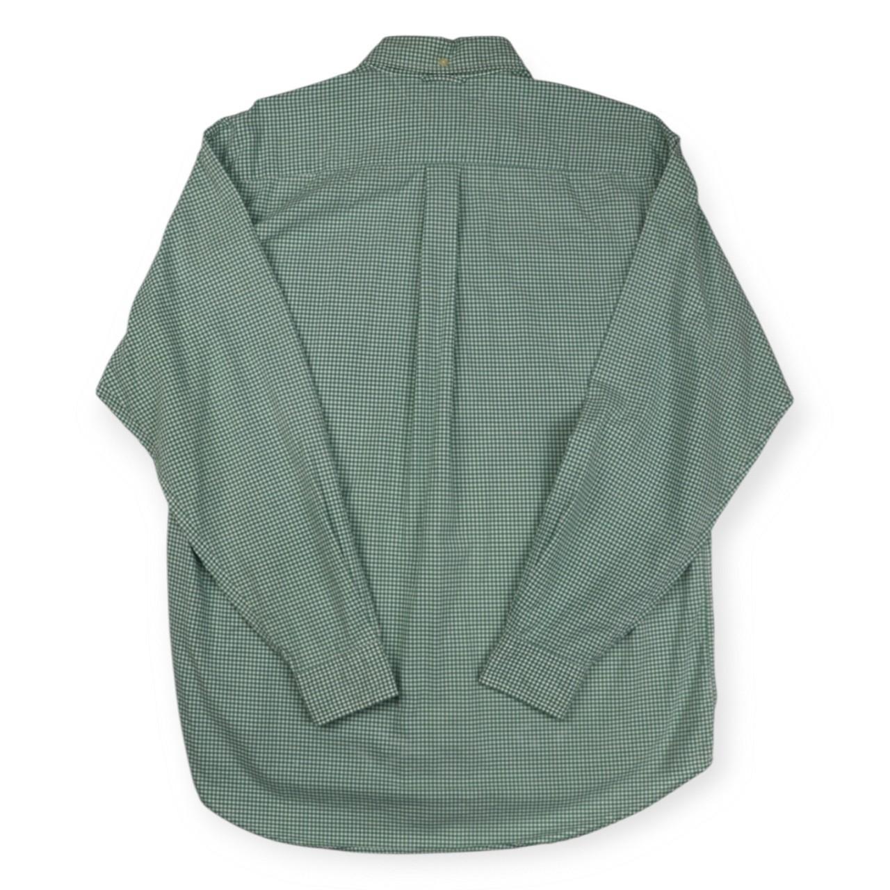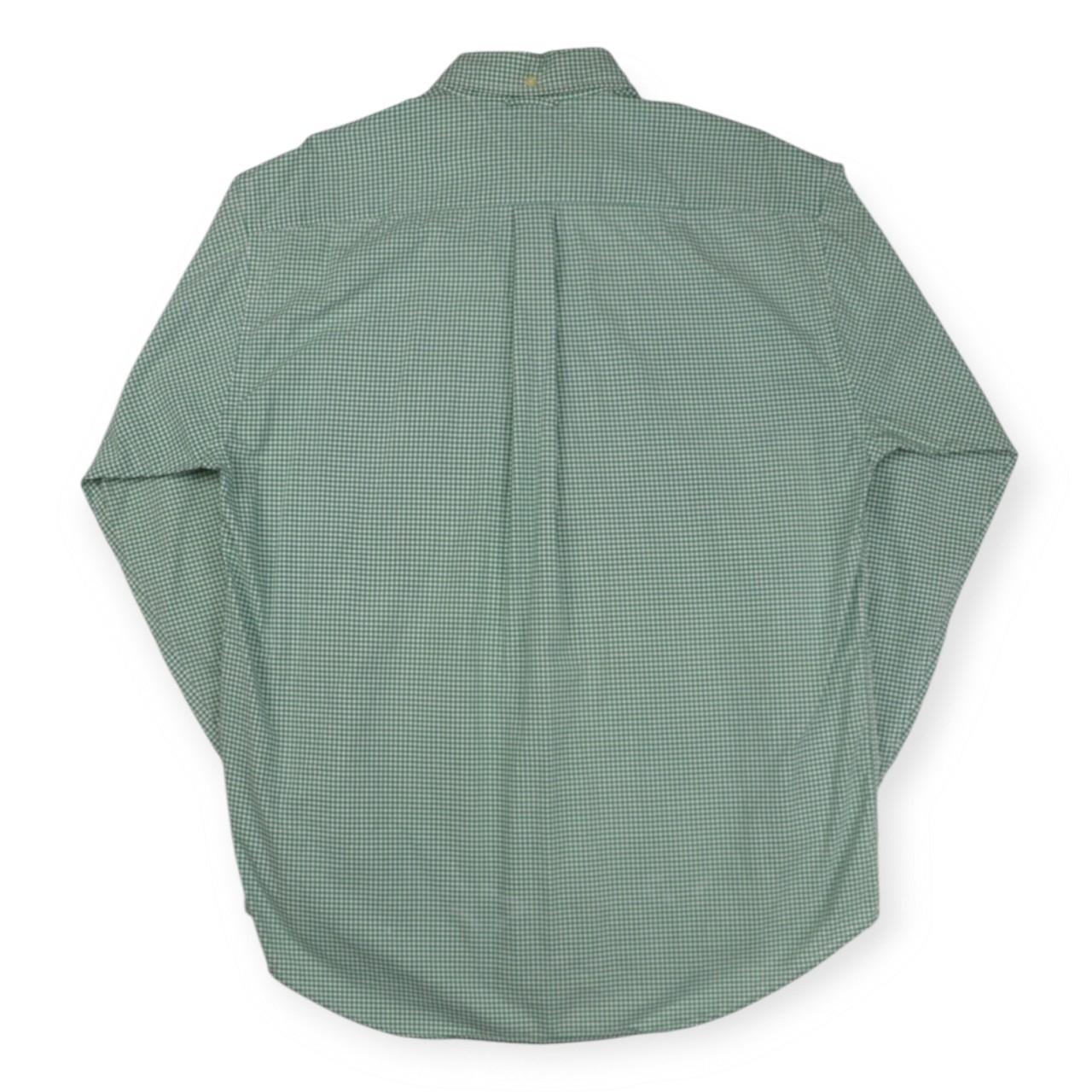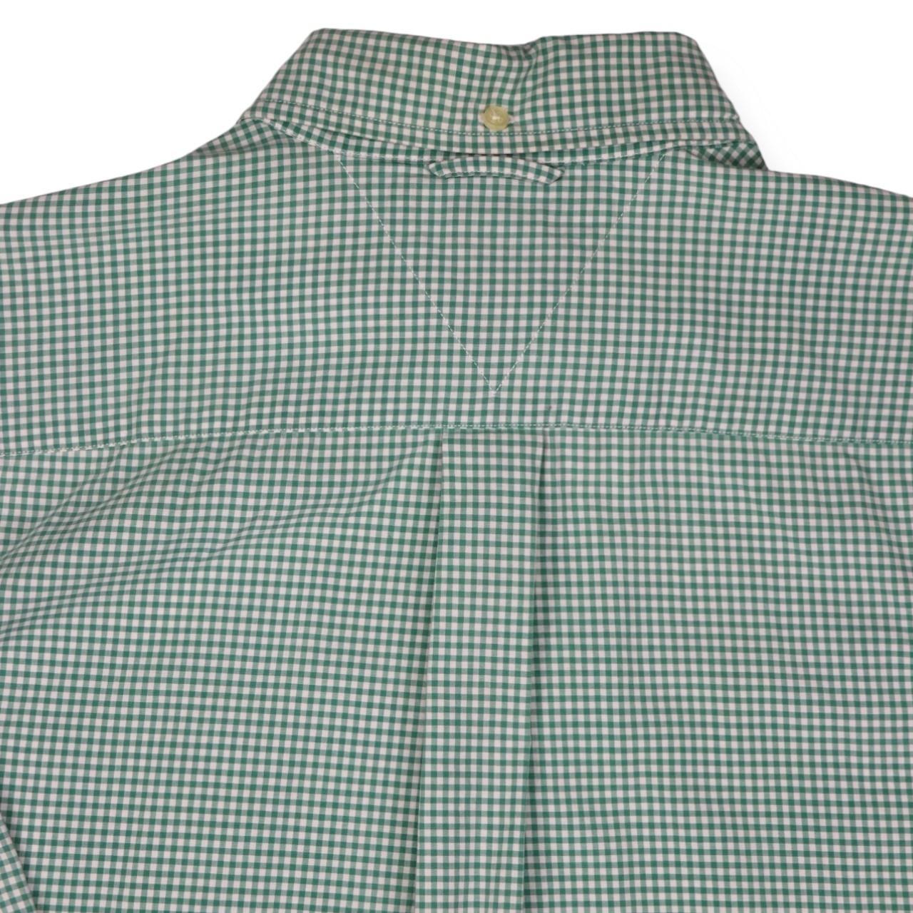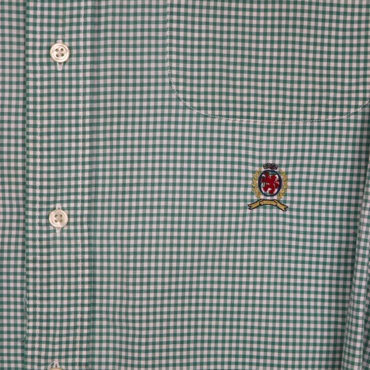 Classic, pastel green and white, Tommy Hilfiger, long sleeved shirt. Large embroidered, Tommy Hilfiger, vintage crest logo found, left hand side, underneath pocket. Pocket found, left hand side of main placket. Tight, plaid design. Sophisticated, preppy shirt. Ideal for wear during all types of seasons. Button found on rear of collar. Regular fit. Perfect for any formal/ semi- formal occasion. Great for gifting. Luxurious piece. Retro item.