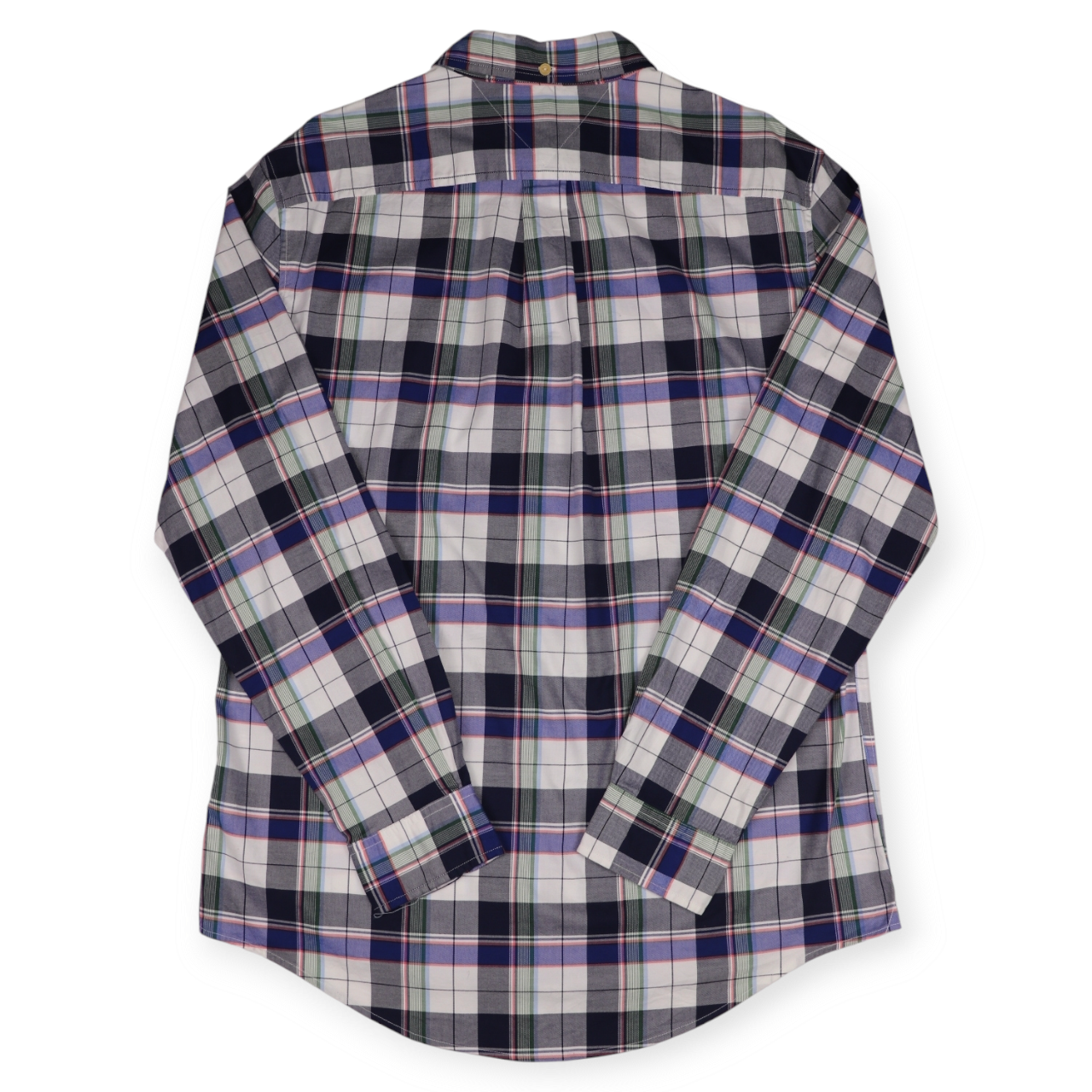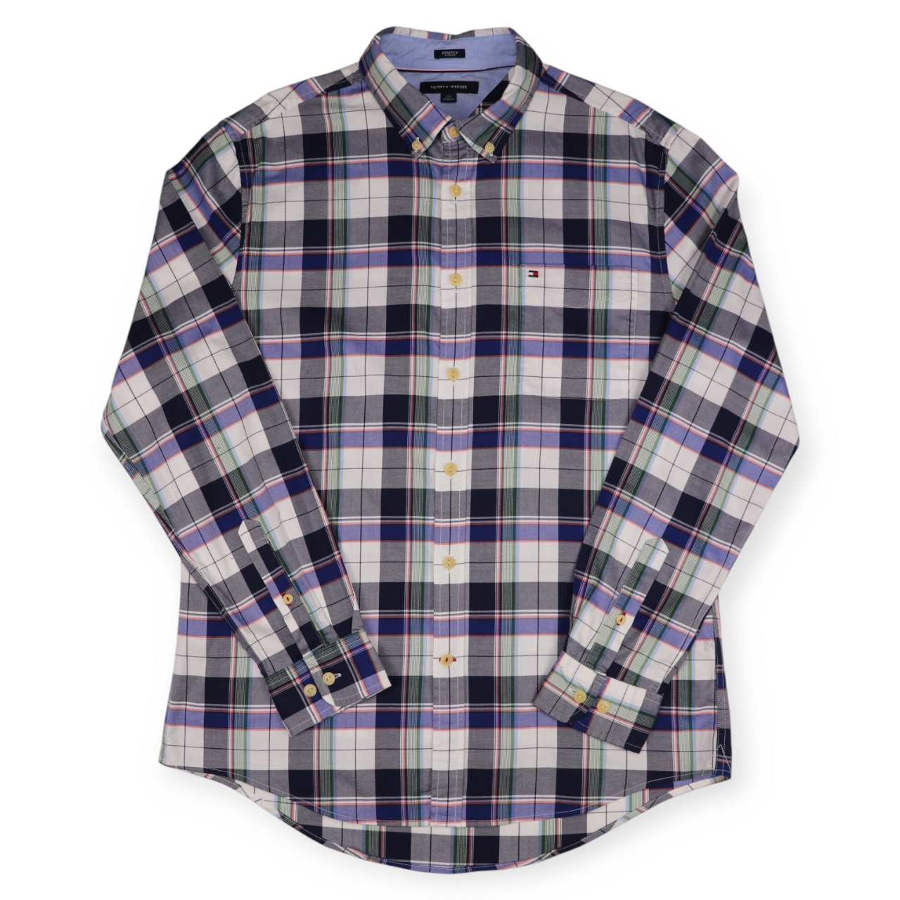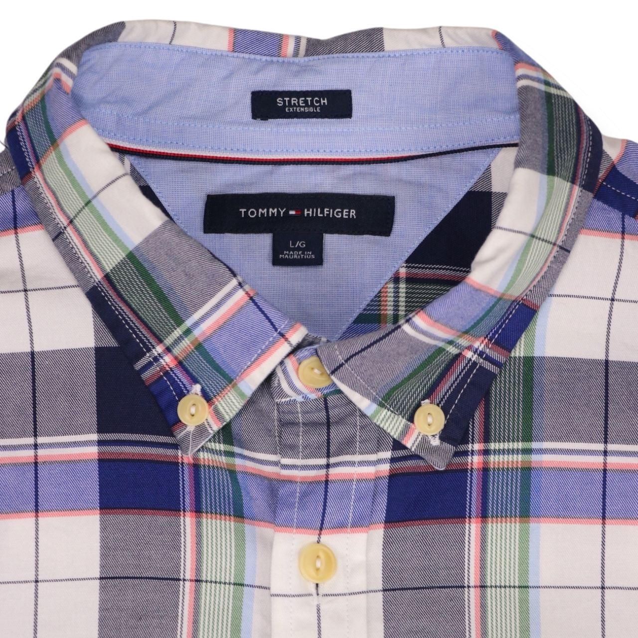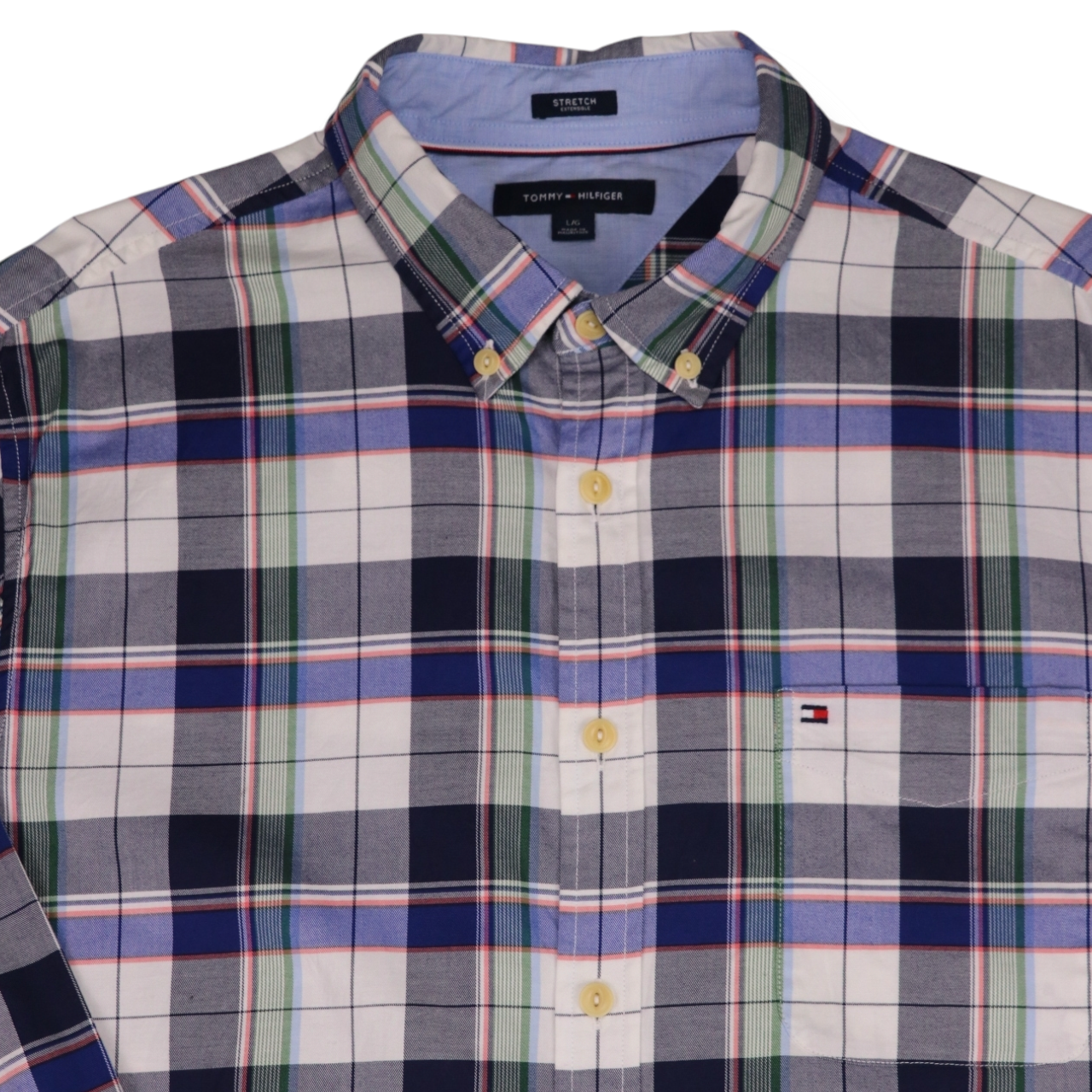 Classic, blue, red, green and grey, plaid, Tommy Hilfiger, long sleeved shirt. Small embroidered, Tommy Hilfiger logo found, left hand side. Pocket found on left hand side. Sophisticated, preppy shirt. Ideal for wear during all types of seasons. Beige buttons. Button down shirt. Stretch. . Perfect for any formal/ semi- formal occasion. Great for gifting. Luxurious piece.