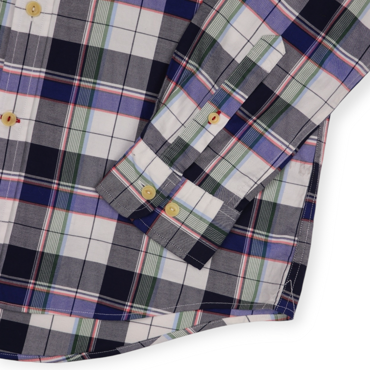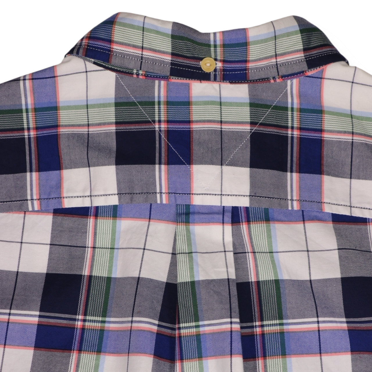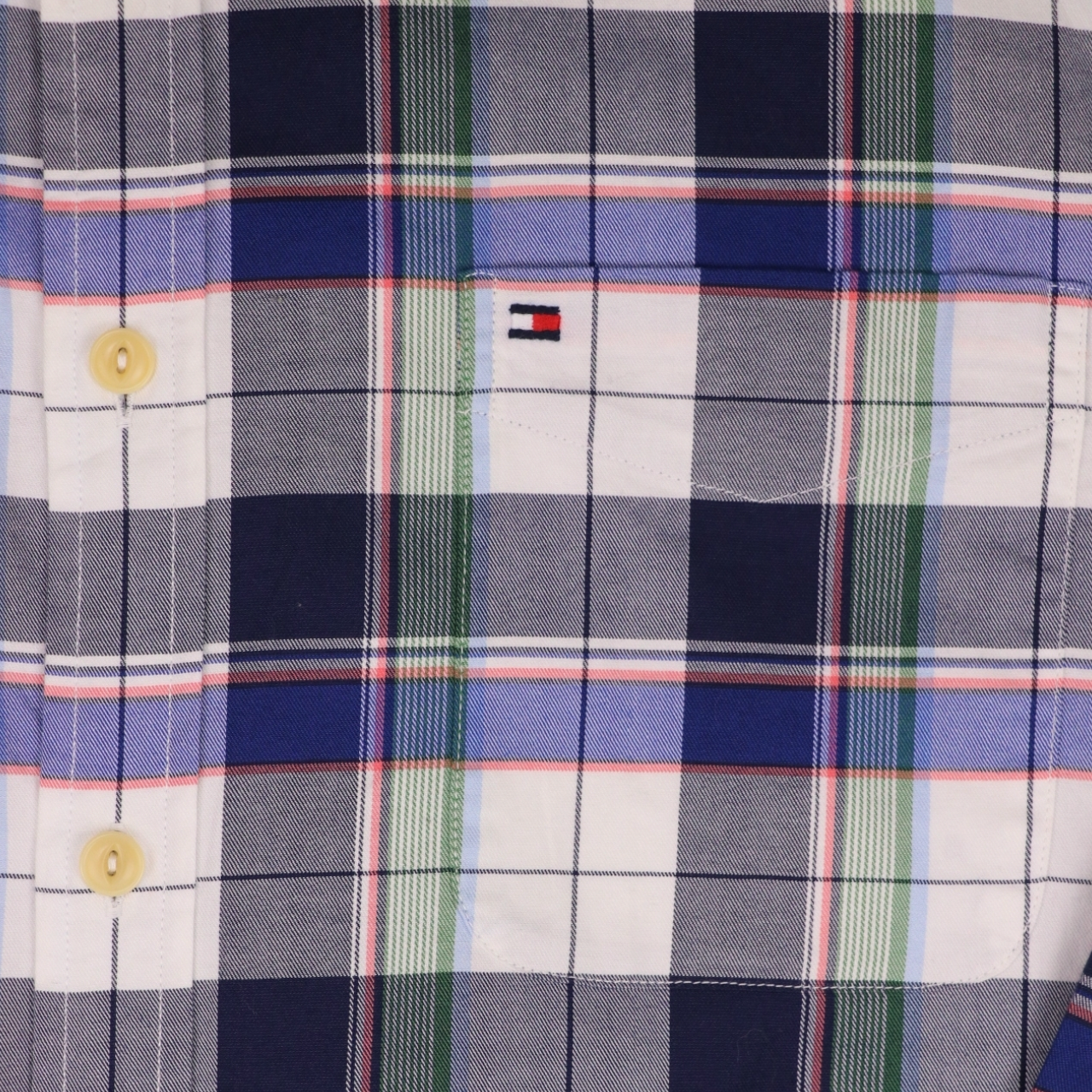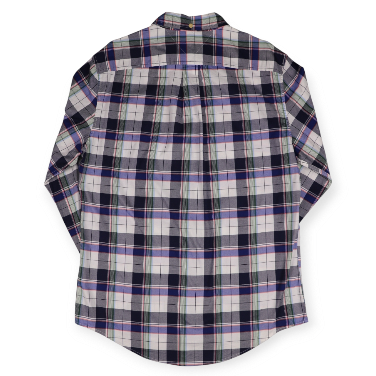 Classic, blue, red, green and grey, plaid, Tommy Hilfiger, long sleeved shirt. Small embroidered, Tommy Hilfiger logo found, left hand side. Pocket found on left hand side. Sophisticated, preppy shirt. Ideal for wear during all types of seasons. Beige buttons. Button down shirt. Stretch. . Perfect for any formal/ semi- formal occasion. Great for gifting. Luxurious piece.